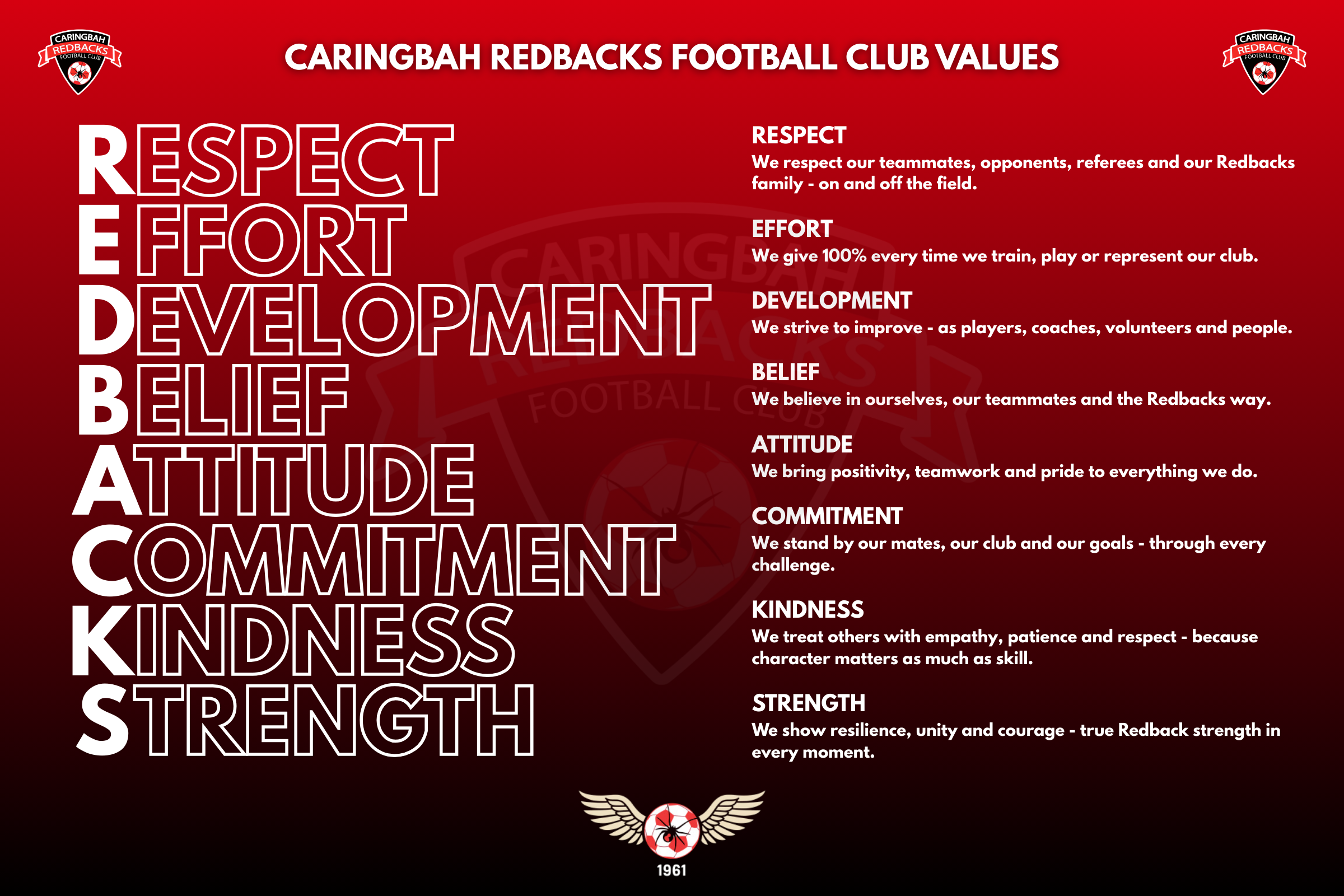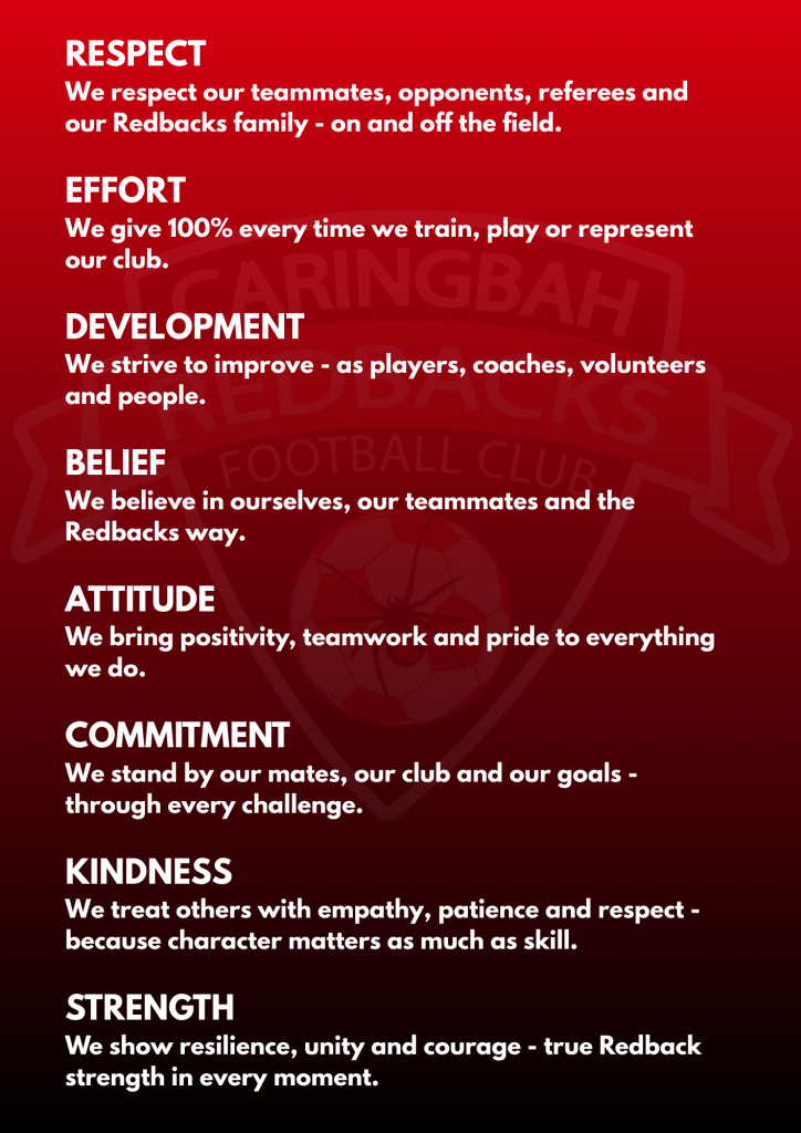 They guide our decisions, shape our culture and help ensure Caringbah Redbacks FC remains a club where people feel welcome, supported and proud to belong.